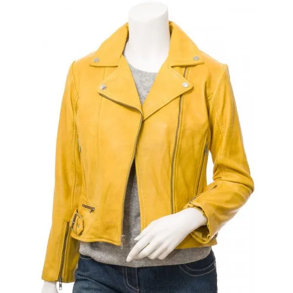 The Yellow Womens Biker Jacket is a standout piece that infuses a conventional motorcycle format with a vibrant, cutting-edge twist. Crafted from fantastic leather-primarily based, this jacket boasts a rich, buttery texture and an eye catching yellow hue that exudes self warranty and strength. The formidable color makes a putting statement, setting it other than conventional biker jackets and along with a fresh splash of brightness to any outfit.