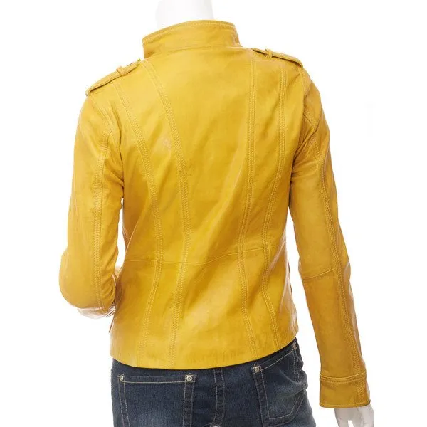 Biker Yellow Leather Four Zipper Pockets Jacket For Women